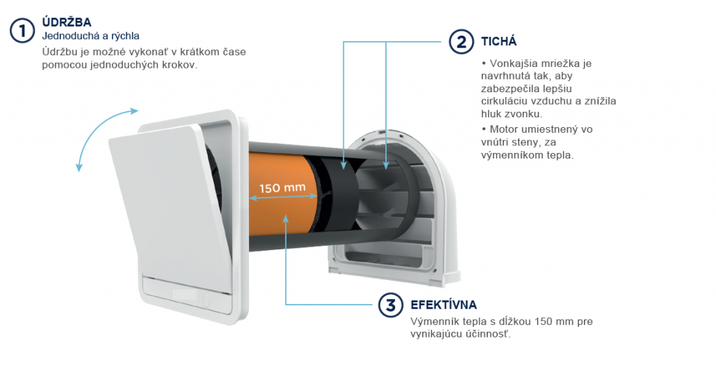 S prietokom vzduchu až 60 m³/h táto vetracia jednotka zaisťuje efektívnu výmenu vzduchu aj vo veľkých miestnostiach.